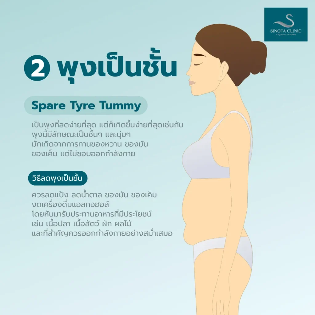 Spare Tyre Tummy This type is the easiest to reduce but also the quickest to develop. It presents as soft, layered fat and is often associated with a diet high in sweets, fats, and salt, coupled with insufficient physical activity.