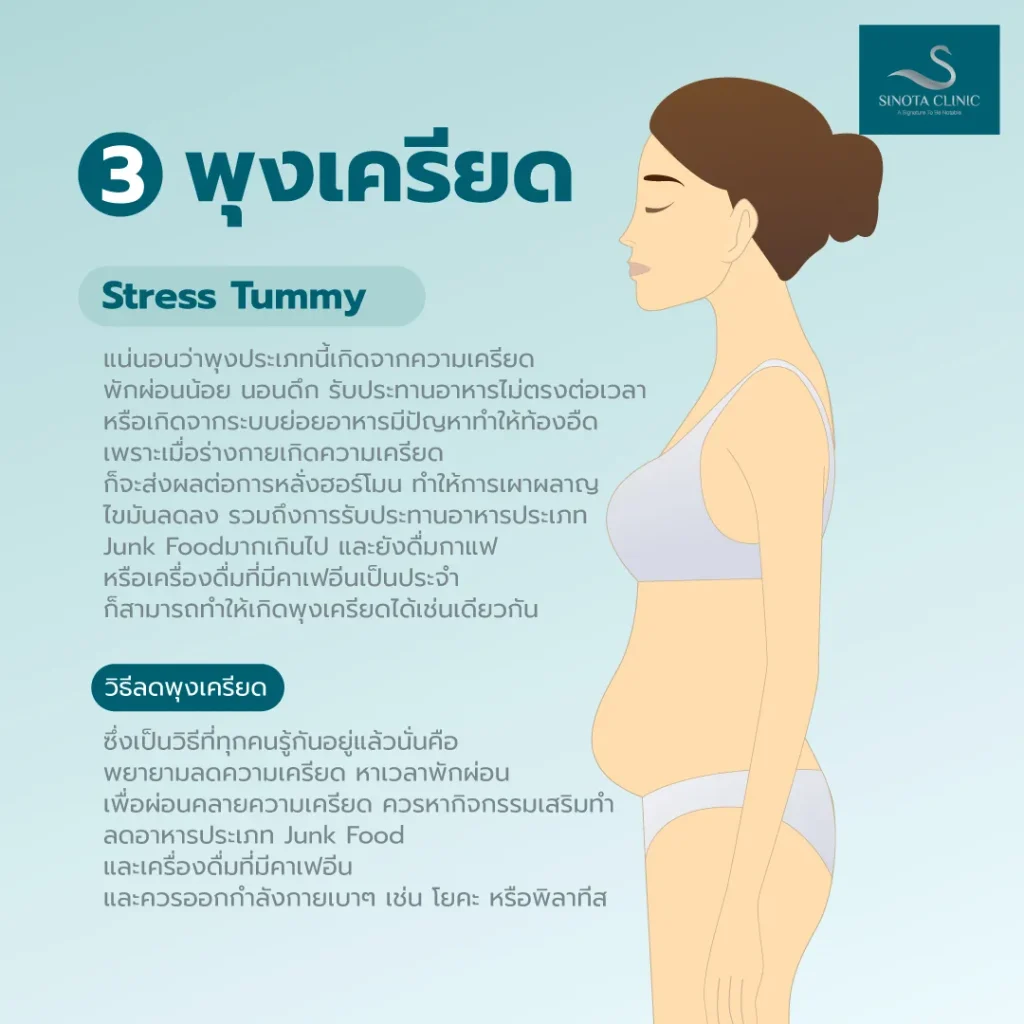 Stress Tummy This type results from stress, inadequate rest, irregular sleep patterns, and inconsistent meal times. It can also stem from digestive issues leading to bloating. Stress affects hormones controlling metabolism, reducing fat burning. Excessive consumption of junk food and caffeinated beverages can also contribute.
