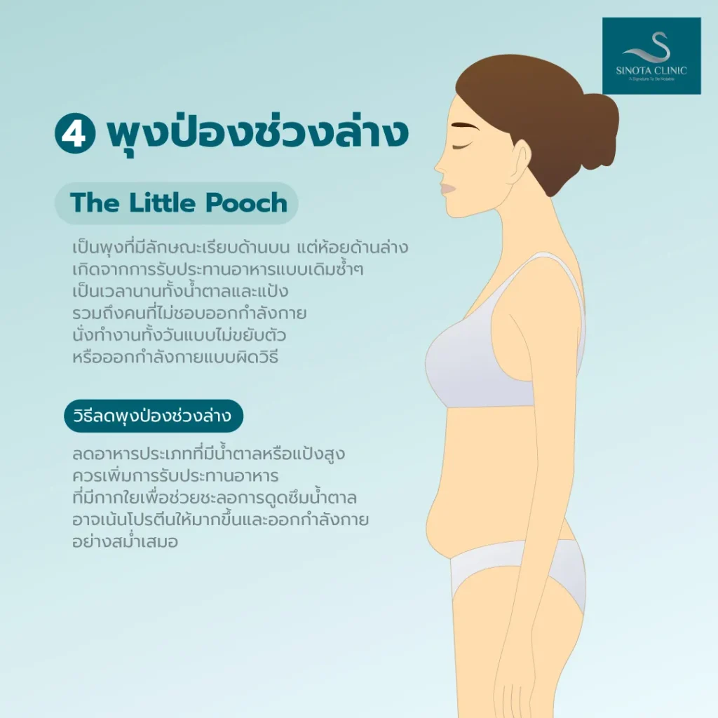 The Little Pooch Characterized by a flat upper abdomen but protruding lower abdomen. It often results from a repetitive diet high in sugar and carbohydrates, sedentary lifestyle, or improper exercise techniques.