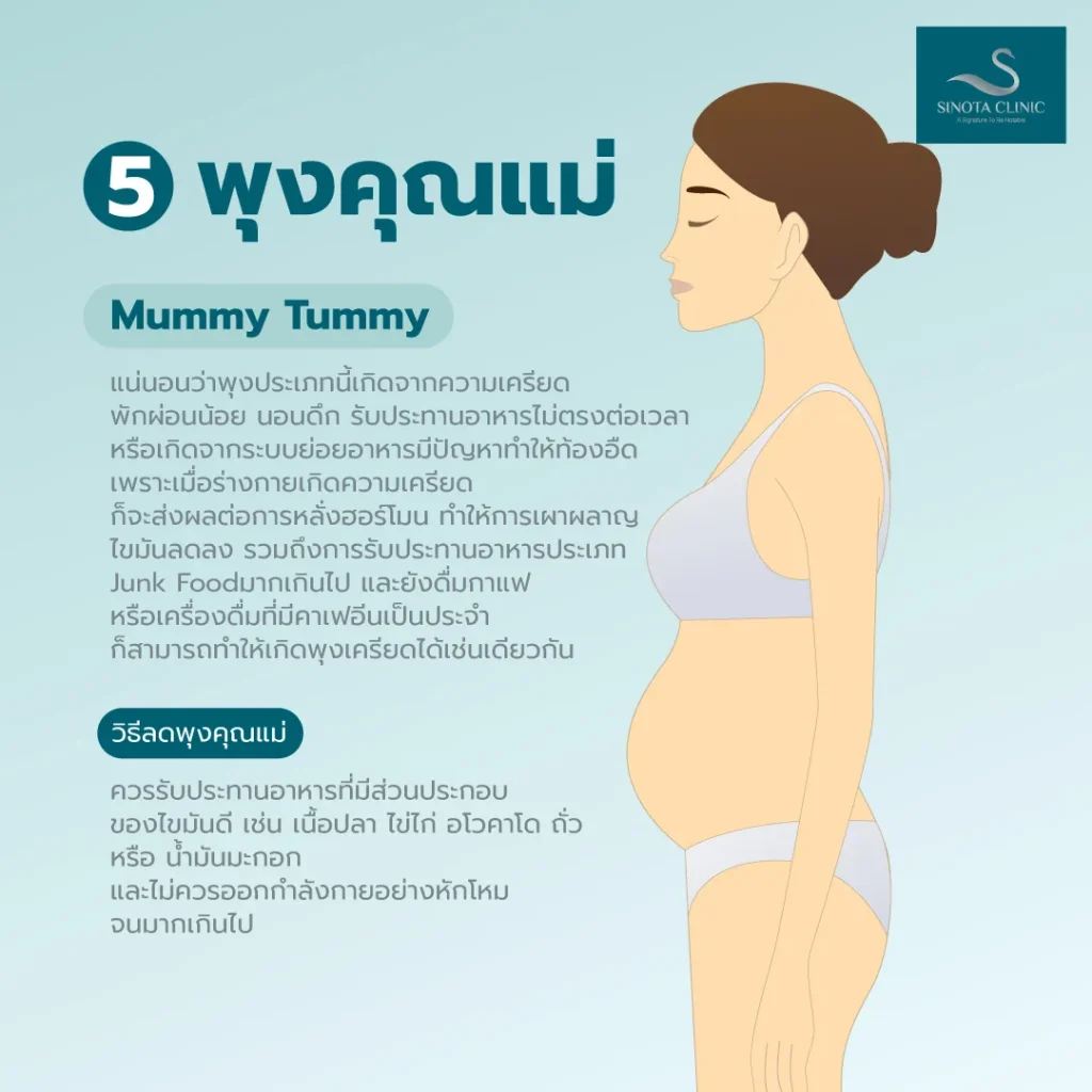 Mummy Tummy Common in women after childbirth, presenting as a sagging or ring-shaped protrusion. It often results from the uterus not fully returning to its pre-pregnancy state, which typically takes about six weeks.