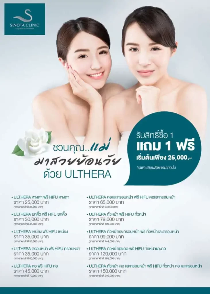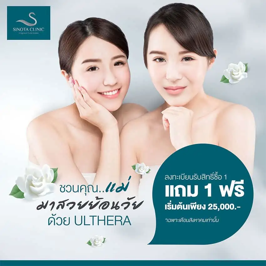 To give back to all beloved mothers, Sinota Clinic invites everyone to join in telling their mothers they love them. Invite mothers to look back to their youth with ULTHERA. Just fill out the registration and receive the right to buy 1 get 1 free (HIFU) starting at only 25,000 baht.