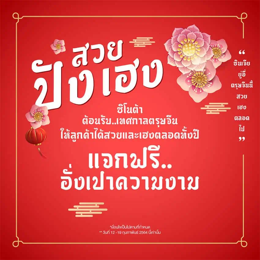 สวย! ปัง! เฮง! แจกฟรี..อั่งเปาความงาม ซิโนต้าต้อนรับเทศกาลตรุษจีน ให้ลูกค้าได้สวย และเฮงตลอดทั้งปี “ซินเจีย ยู่อี่ ตรุษจีนนี้ สวย เฮง ตลอดไป”