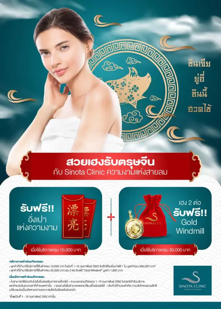 ซินเจียยู่อี่ ซินนี้ฮวดไช้ ซิโนต้าคลินิก จัดกิจกรรมพิเศษต้อนรับตรุษจีน ให้ลูกค้าได้สวยปังและเฮง ตลอดทั้งปี เพียงใช้บริการใดๆ ก็ได้ครบ 10,000 บาท รับสิทธิ์จับอั่งเปาแห่งความงามฟรี! ทันที 1 ใบ และต่อด้วยเฮงชั้นที่ 2 เมื่อใช้บริการครบ 30,000 บาท รับฟรี “Gold Windmill”